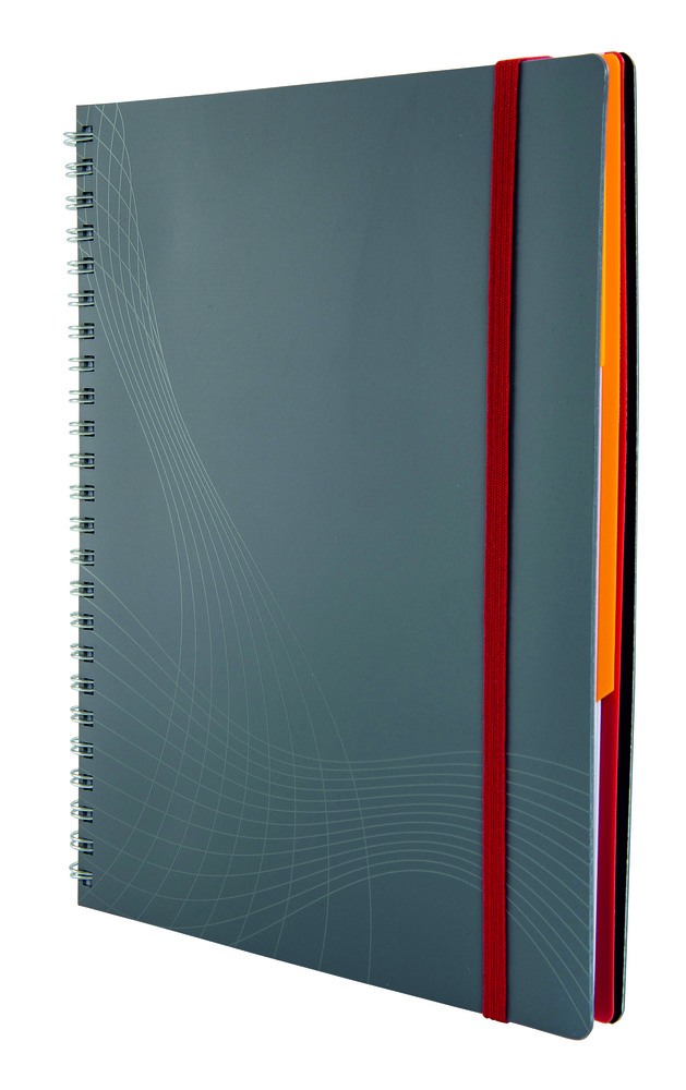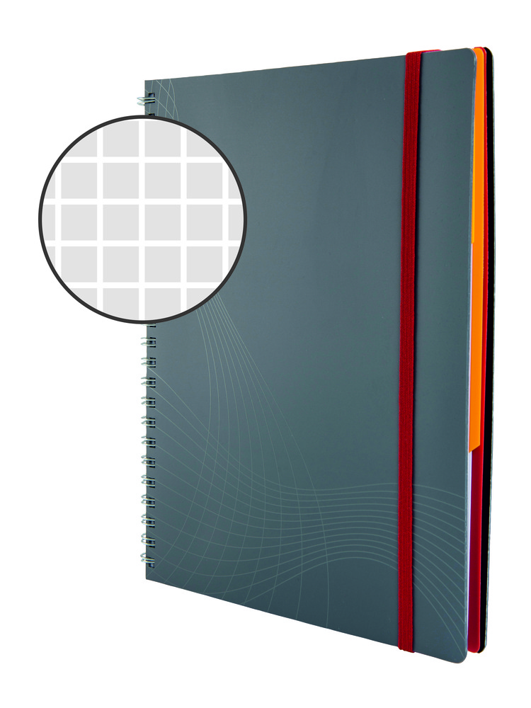innowacyjne rozwiązanie - białe linie na szarym tle komfort użytkowania - wzrok się nie męczy i w prostszy sposób można utrzymać koncentrację linie stają się prawie niewidoczne - podczas kopiowania, skanowania, czy kserowania notes wykonany jest z najwyższej jakości satynowego papieru 90 g/m2 elastyczna gumka ruchome przekładki indeksujące kieszeń na dokumenty mikroperforacja uniwersalne otwory
