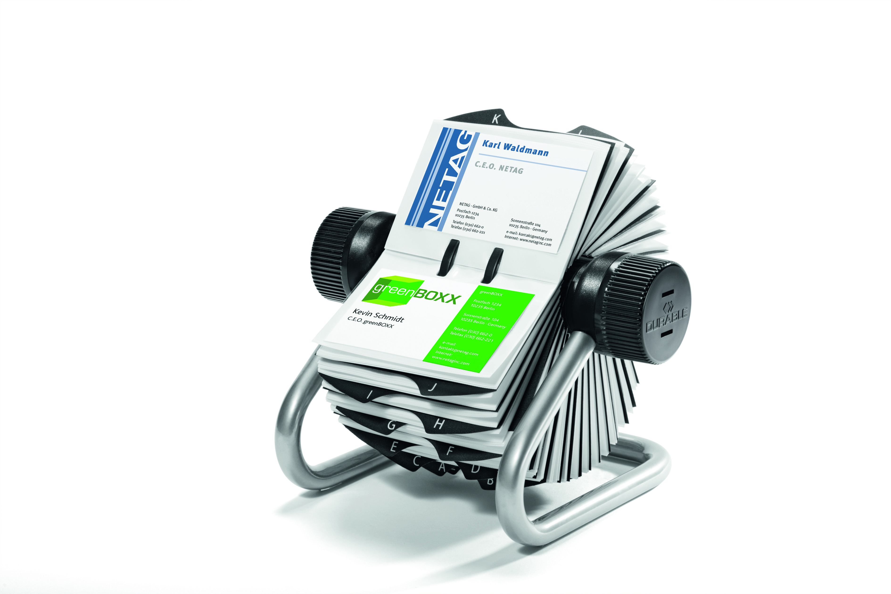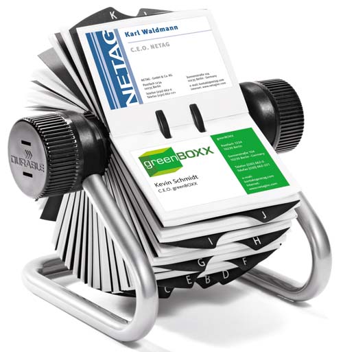 Wizytownik obrotowy na 400 wizytówek. 200 dwustronnych kieszonek na wizytówki. Stabilna metalowa podstawa. Przekładki alfabetyczne A-Z. Kolory: czarny i srebrny.
